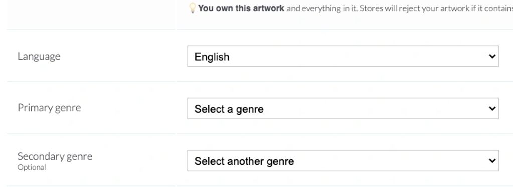 Even if your specific subgenre is not listed, choose a primary and secondary genre that best describes a particular songs tone. This gets sent to Spotify and helps identify who the song will be pushed to using their algorithm